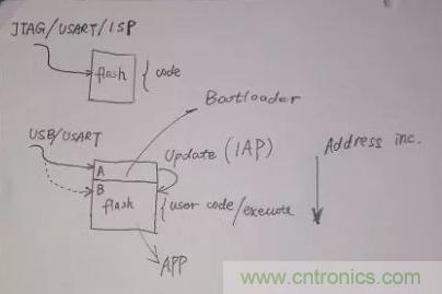 而在IAP編程中,flash被分區(qū)為A和B兩個區(qū)域,A區(qū)域只允許用USB/USART等方式下載,此區(qū)域作為更新B區(qū)域的代碼用。