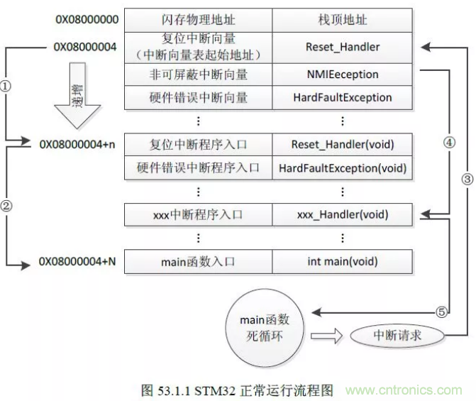 上圖表示STM32正常運行的流程圖,可以看到上電復位后系統(tǒng)從0x80000004處開始運行程序,這里放置的是復位中斷向量,然后跳轉(zhuǎn)至復位中斷程序入口后再跳轉(zhuǎn)至main函數(shù)運行用戶的程序。