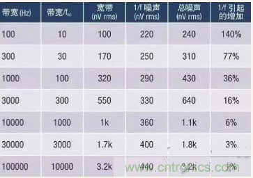 表1:1/f 噪聲影響與電路帶寬的關(guān)系示例