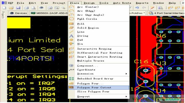 有時我們在鋪完銅之后還需要去刪除一些碎銅,現(xiàn)在可以很方便的實(shí)現(xiàn),點(diǎn)擊 Place—Polygon Pour Cutout