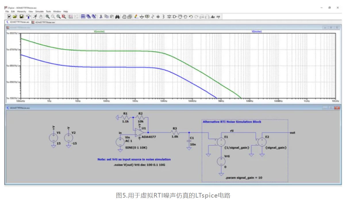LTspice的多功能性和準(zhǔn)確性使其對噪聲仿真非常有用。輸出節(jié)點(diǎn)和輸入源在噪聲仿真命令中指定,輸出噪聲(RTO)是查看分析結(jié)果的默認(rèn)方式。LTspice還會根據(jù)RTI的傳統(tǒng)定義計(jì)算參考到指定輸入源的輸入噪聲,但如圖4所示,對傳統(tǒng)RTI噪聲進(jìn)行積分無法提供有意義的結(jié)果。圖5顯示了如何在LTspice的輸出中添加一級,以便仿真器返回替代的虛擬RTI噪聲。運(yùn)行仿真后,在選定圖形的情況下,從Plot Settings—Add Trace將輸入噪聲添加到圖形中,然后選擇V(inoise)。這會將輸入噪聲添加到圖形中。曲線形狀與輸出噪聲相匹配,表明整個(gè)電路的頻率響應(yīng)都得到了考慮。在按住ctrl鍵的同時(shí)左鍵單擊圖形中標(biāo)題為"V(inoise)"的曲線,以對總RTI噪聲進(jìn)行積分。