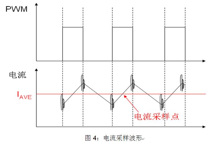 2) 能夠在PWM的開通期間特定時(shí)刻觸發(fā)A/D采樣;因?yàn)樵赑WM逆變器帶感性負(fù)載的控制系統(tǒng)中,由于系統(tǒng)的一些寄生參數(shù)導(dǎo)致PWM在開通和關(guān)斷期間電機(jī)的相線上出現(xiàn)振鈴(如圖4所示),這些振鈴會(huì)耦合到A/D采樣的回路中,因此我們應(yīng)避開在PWM開關(guān)過程中進(jìn)行A/D采樣。如果我們?cè)赑WM開通期間的中點(diǎn)觸發(fā)電流采樣,我們將會(huì)得到電流的平均值,這將有利于我們對(duì)電流補(bǔ)償?shù)目刂啤?