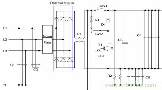 電源系統(tǒng)是指將輸入系統(tǒng)的動力電源轉(zhuǎn)換成用于驅(qū)動交流電機的直流或交流電源,根據(jù)實際控制方式的不同,一般可以分為“交直交”電壓源型逆變電路,“交直交”電流源型逆變電路,“交交”型變頻電路以及泵電源電路等。圖1是“交直交”電壓源型電源系統(tǒng)的典型電路,如果將并聯(lián)的濾波電容去掉,在直流側(cè)串聯(lián)一個大濾波電感則為“交直交”電流源型電路。