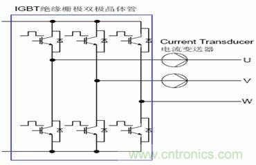 功率開關(guān)器件通過根據(jù)來自微處理器板的控制信號控制大功率輸出器件的關(guān)斷和導(dǎo)通,來實現(xiàn)對交流電機的輸出電流和電壓的控制。根據(jù)控制方式的不同,其輸出方式由方波輸出逐漸發(fā)展到PWM輸出或SPWM輸出。開關(guān)器件也由原來的GTR,MOSFET,發(fā)展到IGBT,IPM等。參見下面的典型IGBT逆變輸出電路。