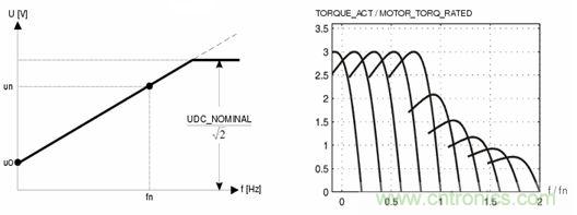 當(dāng)電機在額定頻率以上調(diào)速時,逆變器的輸出頻率可以繼續(xù)升高,但是輸出端電壓只能維持在額定輸入值,此時定子磁通和調(diào)速頻率成反比下降,異步電機的工作狀態(tài)等同于直流電機的弱磁升速,電機的輸出扭矩隨磁通變化,輸出扭矩隨速度增加逐漸變小為恒功率工作模式。