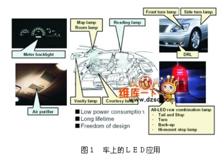 LED已經(jīng)廣泛的應(yīng)用于車(chē)內(nèi)的相關(guān)照明或指示用光源,由圖1可知,從車(chē)內(nèi)的儀表板燈、車(chē)頂燈、化妝燈、迎賓燈等,到車(chē)外的尾燈、前后轉(zhuǎn)向燈、倒車(chē)燈、第三剎車(chē)燈等都可見(jiàn)到LED的相關(guān)應(yīng)用。