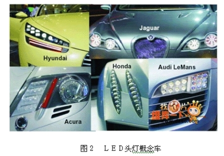 從LED的應(yīng)用歷史來(lái)看,早在1992年時(shí)已經(jīng)有LED應(yīng)用于第三剎車(chē)燈上的先例;而在2000年時(shí)則進(jìn)一步的應(yīng)用于尾燈、轉(zhuǎn)向燈與剎車(chē)燈;到了2002年Audi?。粒嘎氏葘ⅲ蹋牛墓庠粗糜谇爸脽艟邇?nèi)作為日行燈,開(kāi)啟了設(shè)計(jì)師與工程師們?cè)谇爸脽艟叩南胂罂臻g。在之后的許多國(guó)際車(chē)展上都可以看到LED作為前照燈源的概念車(chē),如圖2所示。