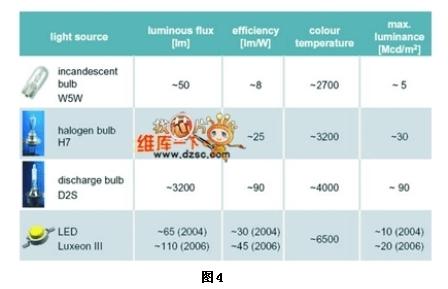 目前使用于車(chē)上的燈源可區(qū)分為白熾燈泡、鹵素?zé)襞?、氣體放電式燈泡與LED光源,其比較如圖4所示。