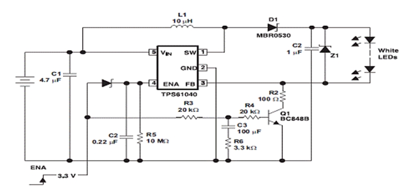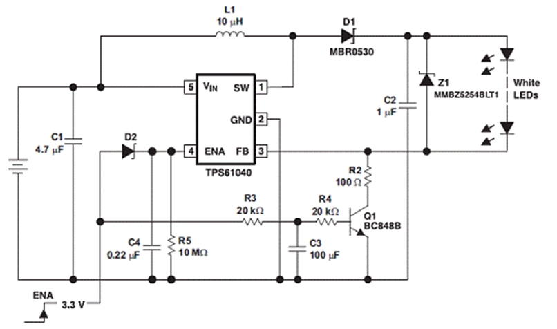 許多采用白光 LED">LED 照明和背光的消費類產(chǎn)品都支持開關時的漸進性 LED">LED 發(fā)光變化。這種漸進性的發(fā)光變化通常要借助可提供 PWM 發(fā)光變化控制功能的微處理器來完成。在此,我們將介紹一款采用德州儀器 (TI) TPS61040 白光 LED">LED 驅動器的電路,其在不使用微處理器的情況下同樣也可以實現(xiàn)開關時的漸進性發(fā)光變化。