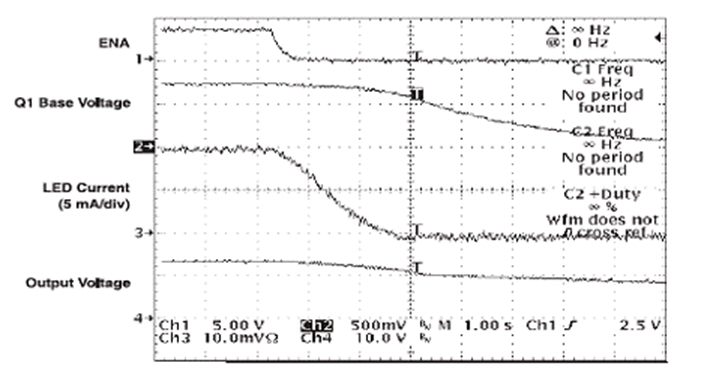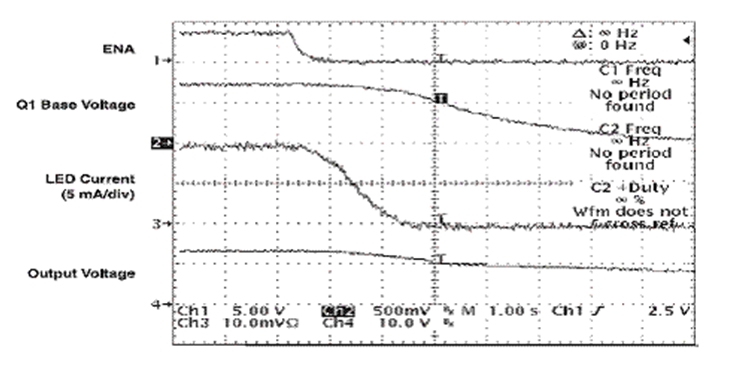 ENA 信號在電路斷開時下降,此時 D2 會阻止 C4 放電。TPS61040 保持開啟狀態(tài),直到 C4 通過 R5 放電。在 TPS61040 仍為開啟狀態(tài)時,C3 開始通過 R3 和 R4 放電。隨著 Q1 可用基線電流 (base current) 的下降,Q1 的有效電阻開始升高。隨著 FB 引腳上總電阻的升高,LED">LED 電流會成比例下降。圖 4 顯示了電路斷開時的相關波形。