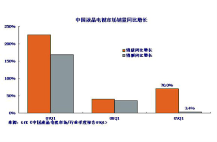 2009年1季度的市場(chǎng)銷量巨大增長(zhǎng),也出乎業(yè)界在2008年末時(shí)的預(yù)料。當(dāng)時(shí)人們更多地是看到中國(guó)液晶電視市場(chǎng)的“增速遞減”狀況:市場(chǎng)增長(zhǎng)從2007年的超過100%,到2008年下降為接近40%。再加上2009年面對(duì)的經(jīng)濟(jì)危機(jī)因素,所以業(yè)界在2008年底對(duì)2009年中國(guó)液晶電視市場(chǎng)的增速判斷為低于40%,估計(jì)在20—30%之間。