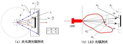 如圖4所示,點(diǎn)光源光強(qiáng)在空間各方向均勻分布,在不同距離處用不同接收孔徑的探測器接收得到的測試結(jié)果都不會(huì)改變,但是LED由于其光強(qiáng)分布的不一致使得測試結(jié)果隨測試距離和探測器孔徑變化。因此,CIE-127提出了兩種推薦測試條件使得各LED在同一條件下進(jìn)行光強(qiáng)測試與評(píng)價(jià),目前CIE-127條件已經(jīng)被各LED制造商和檢測機(jī)構(gòu)引用。