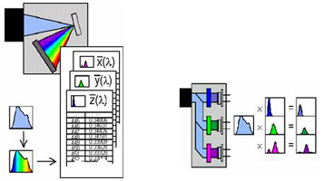 光譜功率分布的測試需要通過分光進(jìn)行,將各色光從混合的光中區(qū)分出來進(jìn)行測定,一般可以采用棱鏡和光柵實(shí)現(xiàn)分光測定。