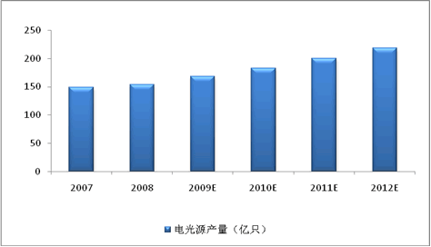 中國電光源(燈泡)行業(yè)能夠持續(xù)快速穩(wěn)定的發(fā)展,其中很重要的原因是產(chǎn)品面向國際和中國兩大市場。在中國和國外消費(fèi)市場推動(dòng)下,2008年中國電光源產(chǎn)量達(dá)154億只,較2007年同比增長3.5%。隨著中國電光源質(zhì)量和技術(shù)標(biāo)準(zhǔn)的提升,預(yù)計(jì)未來中國電光源產(chǎn)量增長率將為維持9%-12%之間。