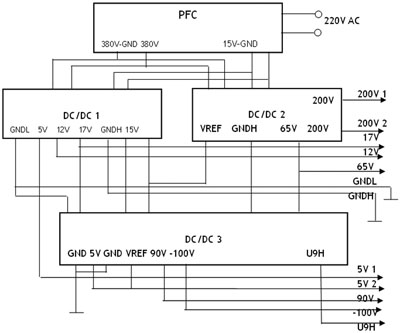 電源作為PDP的重要組成部分,要求效率高、體積小、能夠提供較大的瞬態(tài)輸出功率,并且具有保護(hù)功能和不同輸出電壓按順序啟動的功能。