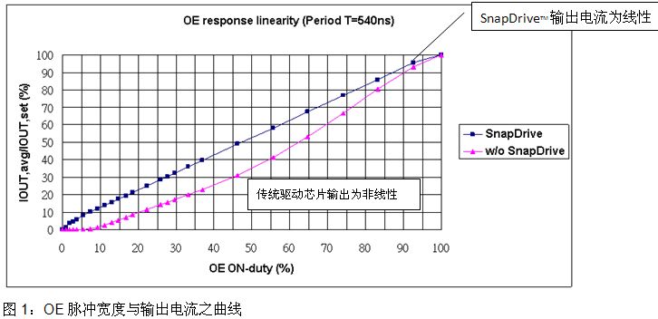 以下為臺灣迅杰科技推出包含SnapDriveTM技術(shù)之驅(qū)動芯片測試條件及結(jié)果,藉圖1及圖3可以明顯看出其驅(qū)動芯片在極小的OE脈沖寬度下其輸出電流仍為線性輸出,而傳統(tǒng)驅(qū)動芯片則無法提供線性的輸出。