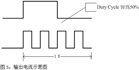 解決LED熱的問題及增加LED的壽命如圖5所示為50%Dutycycle的電流輸出示意圖,若在同一個時間內(nèi)將出電流的脈沖平均打散,不但不影響輸出電流及LED的亮度也可以避免LED長時間的點(diǎn)亮造成LED過熱及壽命提早衰減的現(xiàn)象。[page]