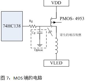 掃描屏上;建議在MOS的Gate端與74HC138之間串一個電阻,以避免VLED端的電感效應(yīng)及MOS端寄生電容所產(chǎn)生的突波,造成74HC138燒毀;建議Rg<100Ω、Cg<47pF(電容部份可選擇不加)。