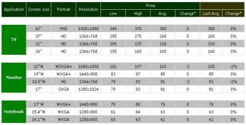 2009年上半年面板價(jià)格預(yù)測(單位:美元)