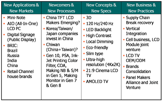在接下來的十年將有八種因素主導(dǎo)著平面顯示器的成長: 新應(yīng)用與新市場、新廠商與新制程、新潮流與新規(guī)格、新商業(yè)模式與新實(shí)踐方式(如圖二)。其中有許多項(xiàng)目是來自于各平面顯示器廠商在2008年底與2009年初這波景氣衰退中所得到的啟示;需求下滑與競爭日益激烈迫使廠商不斷的尋找新的策略、新的市場與新的解決方法,同時推動平面顯示產(chǎn)業(yè)不斷地前進(jìn)。