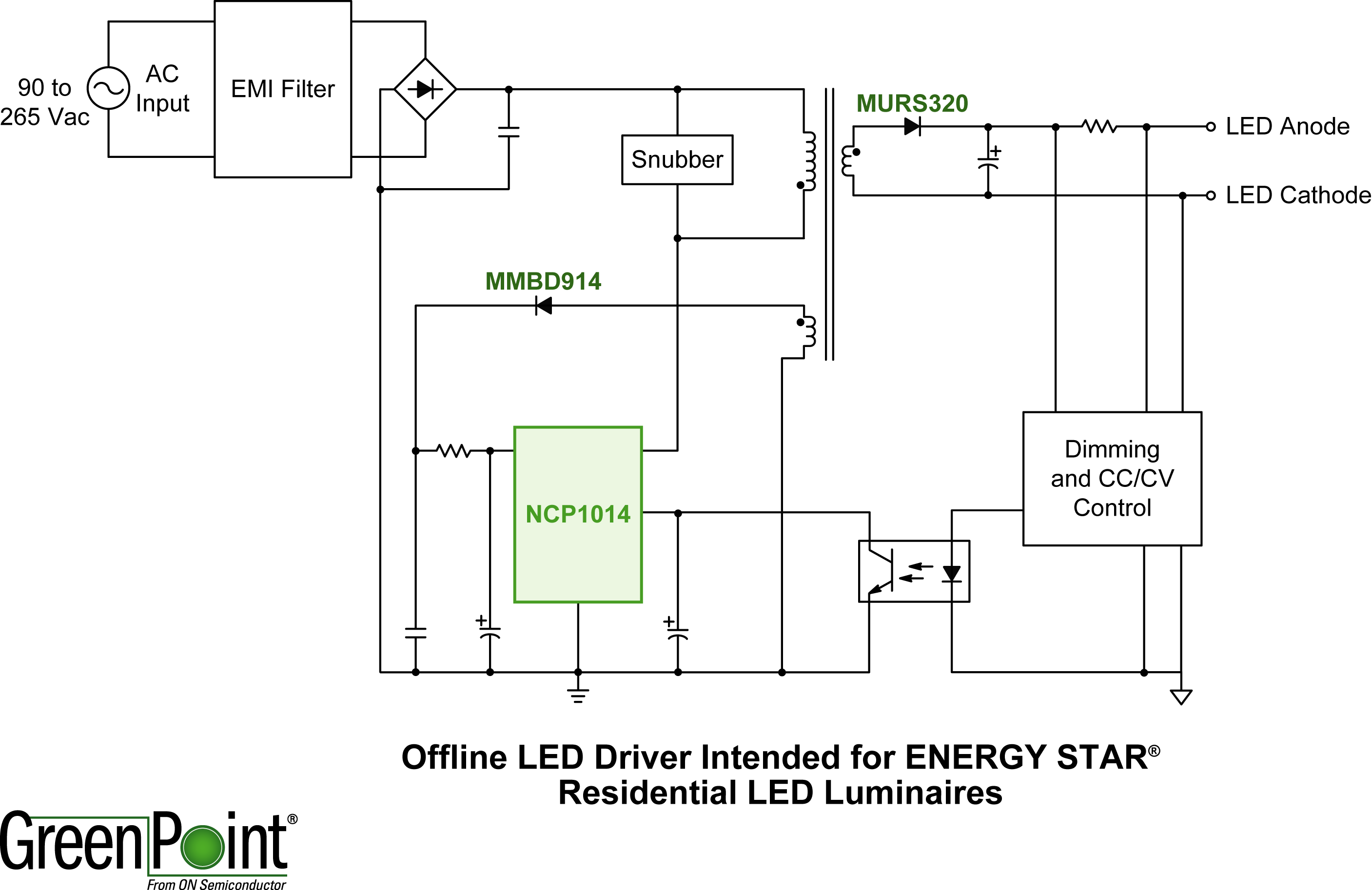 安森美半導體的另一款針對“能源之星”住宅LED照明的離線型LED驅(qū)動器GreenPoint®參考設計經(jīng)過優(yōu)化,驅(qū)動便攜臺燈、櫥柜內(nèi)照明及戶外走廊燈等應用中的1到8顆大功率LED。這參考設計采用新穎的電路配置,無須增加額外的無源功率因數(shù)校正(PFC)網(wǎng)絡,即可在115 Vac條件下提供高于0.85的功率因數(shù),減少了元器件數(shù)量,并輕松滿足住宅LED應用功率因數(shù)要求。這設計支持90 Vac至265 Vac的通用輸入電壓工作,采用安森美半導體集成了固定頻率電流模式控制器和700 V MOSFET的NCP1014開關穩(wěn)壓器集成電路(IC)。