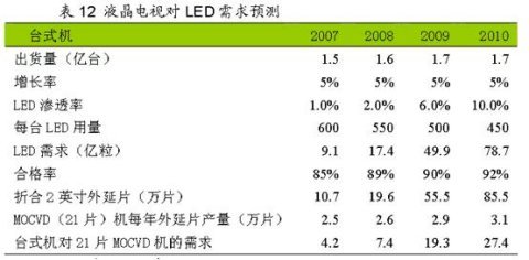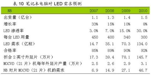 戴爾的這一舉措表明 LED 已經(jīng)不再作為概念機型或者說時尚機型,而是作為標準配置,其價格策略必然不再采取高端策略。戴爾作為行業(yè)內(nèi)的領導廠商之一,其他公司必然跟進。因此2009 年LED 在筆記本的滲透率有望達到20%以上。2007年全球筆記本出貨1.09 億臺,2008年增長15%,2009 年增長10%,則2009 年筆記本出貨1.4 億臺,其中將有2800 萬臺使用LED,對LED 的需求量是70.3 億粒。