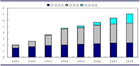 2008年全球LED市場規(guī)模約為69億美元,其中高亮度和超高亮度LED 市場年平均增長率將達到20%左右,市場規(guī)模達16億美元。在移動手機應用市場的快速推動下,過去10年高亮度LED市場的年均增長率達到46%。