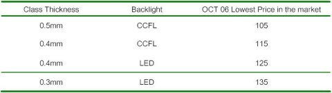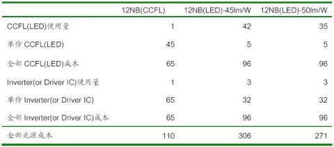 厚度方面目前LED 背光筆記本的厚度也已經(jīng)取得優(yōu)勢,以13.3 英寸白光LED 筆記本面板為例,厚度可以薄40%,重量可以輕20%。受下游筆記本廠商銷售策略影響2008 年LED 普及未達預期,LED 在各方面都優(yōu)于CCFL,但其價格高于后者。RGB LED 背光比CCFL 背光筆記本面板貴50 至80 美元;白光LED 價格比CCFL高出不到25 美元,但白光LED 對CCFL 優(yōu)勢會打折扣。目前市面上已經(jīng)有多款LED 背光屏筆記本電腦,業(yè)內(nèi)曾經(jīng)預期2008 年LED 背光板會在NB 中大行其道,不過由于下游整機廠商2008 年仍然把LED 應用作為高端機型使用,其價格與普通筆記本的差額遠遠高過使用LED 背光源增加的成本。