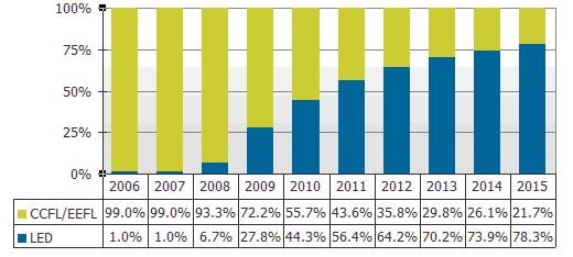 2006-2015采用傳統(tǒng)CCFL&EEFL燈管與LED背光大尺寸液晶面板出貨比率預(yù)測