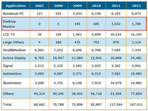 2007-2012 LED按應(yīng)用領(lǐng)域區(qū)別的出貨量預(yù)測(單位:百萬顆)