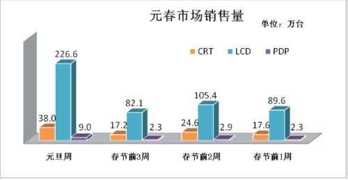 在整個(gè)元旦到春節(jié)前的旺季市場(chǎng),彩電的零售量將達(dá)到617.8萬(wàn)臺(tái),與去年旺季期間相比將有19%的增長(zhǎng)。 其中元旦周273.7萬(wàn)臺(tái),春節(jié)前一周132.9萬(wàn)臺(tái),是零售量較大的兩周,這兩周將約占整個(gè)旺季銷售的2/3。(詳見下圖)