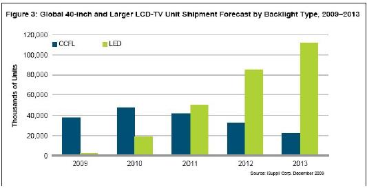 到 2013 年,83.2%的40 英寸以及更大的液晶電視將使用LED 背光,而2008 年該比例只有0.1%,2009 年是6%。