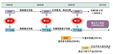 在液晶顯示器市場剛開始啟動(dòng)的1998年,當(dāng)時(shí)的夏普公司社長(現(xiàn)任董事長)町田勝彥的發(fā)言震驚了整個(gè)行業(yè)。他表示: “到2005年,夏普在日本國內(nèi)銷售的電視將全部采用液晶屏。” 當(dāng)時(shí),液晶電視并未普及,在夏普公司內(nèi)部對(duì)于彩色液晶屏也并沒有十足的把握。但是,這一句話成為液晶電視掃蕩市場的導(dǎo)火索,那以后,液晶電視以超乎町田勝彥預(yù)想的驚人速度推廣開來。在此過程中,液晶與PDP(等離子)、SED(表面?zhèn)鲗?dǎo)電子發(fā)射顯示)等技術(shù)展開了激烈的競爭(見圖3)。