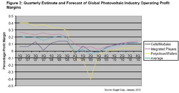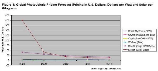 2009 年,光伏系統(tǒng)的平均價(jià)格下跌11%左右,而晶體硅組件的平均價(jià)格重挫了38%。iSuppli 公司預(yù)測(cè),2010 年光伏系統(tǒng)的價(jià)格將下降10%,組件價(jià)格將再下跌20%。
