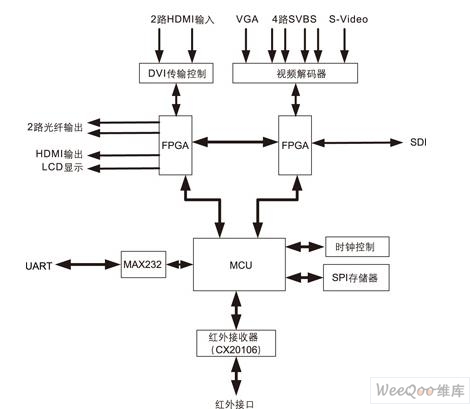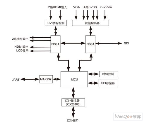 根據(jù)LED顯示屏需具有較高的顯示性能和效果,以及方便控制的需求,顯示屏控制系統(tǒng)應(yīng)具有足夠的輸入、輸出接口和遠(yuǎn)程通信功能。我們基于HDMI1.3技術(shù)的LED顯示屏控制器的系統(tǒng)結(jié)構(gòu)如圖1所示。系統(tǒng)按功能可分為以下幾個(gè)模塊:6路模擬量輸入、2路DVI輸入、1路VGA輸入、RS-232和RS-485通信、光纖數(shù)據(jù)傳輸、實(shí)時(shí)時(shí)鐘以及狀態(tài)指示等。
