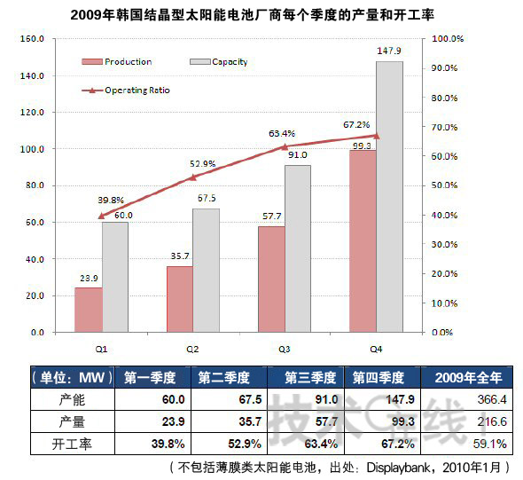 據(jù)韓國調查公司Displaybank稱,韓國結晶硅型太陽能電池廠商的設備開工率已經(jīng)恢復。受經(jīng)濟危機的影響,韓國結晶硅型太陽能電池廠商的設備開工率在2009年第一季度跌至39.8%,但在2009年第四季度已提高至67.2%。