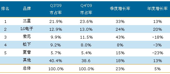 以銷售金額統(tǒng)計,三星在2009年第四季的全球電視市場占有率達到23.6%,并創(chuàng)下新高。三星的高銷售金額占有率主要來自于其在全球電視市場出貨量的領(lǐng)導地位、完整且堅強的產(chǎn)品尺寸布局、以及在先進技術(shù)與規(guī)格如LED背光源、超倍頻驅(qū)動等的領(lǐng)導地位,這些也造成了三星的電視平均實際銷售單價高于其它品牌。三星已經(jīng)連續(xù)超過13個季度取得全球電視出貨量與銷售金額的雙料冠軍。2009年全年三星的市場銷售金額占有率達到了22.6%。