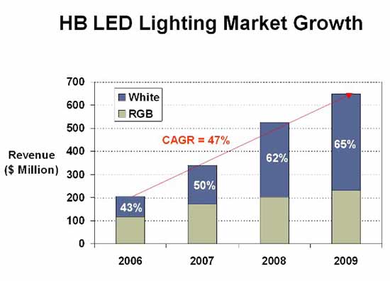 就LED的實際使用而言,由于電視制造商主要采用中功率LED,因此,中功率LED的銷售額飆升152%.Bob Steele表示,先前,汽車業(yè)制造商一直在采用中功率LED.