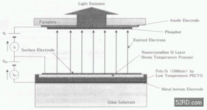 綜合以上的說明可知BSD的電子釋放機(jī)制,是當(dāng)電壓注入上方電極與背面基板之間時,下方鋁質(zhì)電極所產(chǎn)生的電子會注入PPS層內(nèi)的微結(jié)晶硅,而電子通過微結(jié)晶硅內(nèi)部時幾乎沒有能量損耗(energyloss),主要原因是一旦施加電界后,微結(jié)晶硅表面的氧化膜會使電子加速。此外一般硅內(nèi)部的平均自由行程約為50nm,而微結(jié)晶硅的glensize祇有5nm。由于當(dāng)電子通過PPS層時,幾乎不會與其它電子或硅原子發(fā)生沖突,因此電子通過微結(jié)晶硅內(nèi)部時,能量損耗幾乎等于零,使得到達(dá)上方金屬電極的電子能量減去金屬的動作關(guān)數(shù)值最大可達(dá)14~15eV,這種現(xiàn)象稱為彈道電子傳導(dǎo)效應(yīng)。以往的彈道電子傳導(dǎo)效應(yīng)必需在真空環(huán)境下才會發(fā)生,不過BSD利用多孔化(porous)將復(fù)晶硅膜(polysilicon)包覆,因此它可在固體中產(chǎn)生彈道電子釋放現(xiàn)象。利用這樣的特性制作FED時可使已加速的電子,在cellgap內(nèi)部呈垂直狀發(fā)射出,并使電子撞擊正面基板表面上的螢光體產(chǎn)生影像。由于BSD的電子發(fā)射源可將電子呈垂直狀發(fā)射出去,因此cellgap高達(dá)數(shù)mm的高電壓型FED,也不需要設(shè)置電子束收歛電極防止失真(crosstalk)現(xiàn)象。