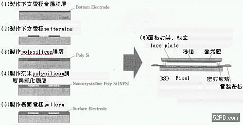 利用ECO制程形成氧化膜后立即進(jìn)行清洗、干燥、濺鍍,接著進(jìn)行表面電極與電極patterning,便完成所有BSD電子源的作業(yè)流程。
