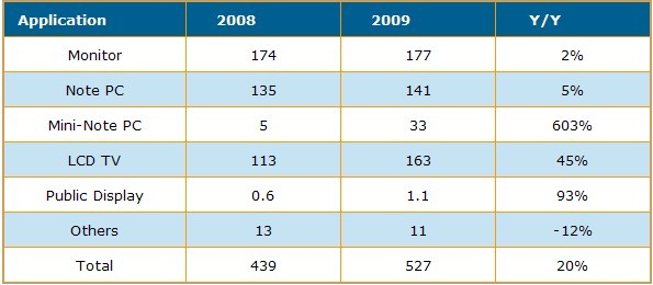 雖然液晶顯示器對(duì)大尺寸液晶面板而言是一個(gè)較成熟的市場,2009年出貨量僅較2008年成長2%,而與2007年相同。筆記型計(jì)算機(jī)與迷你筆記本電腦用面板合計(jì)出貨達(dá)一億7千500萬片,2009年年成長率約25%。電視面板表現(xiàn)最為亮眼,出貨量成長45%,達(dá)1億6千300萬片。另外,公眾顯示器面板出貨成長93%,從90萬片成長到110萬片。