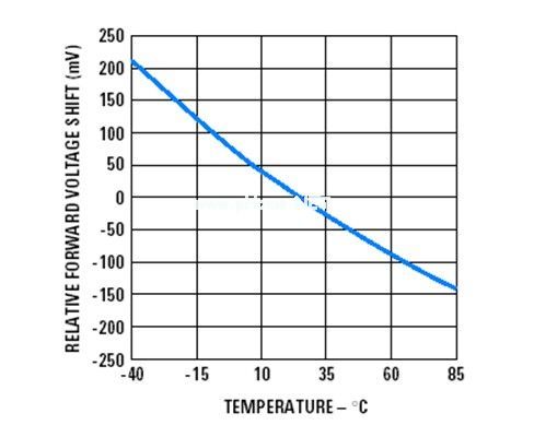 從圖1.2可以看出,隨著溫度的上升,會(huì)逐漸變小,相反,當(dāng)溫度降低時(shí),會(huì)增加。當(dāng)LED的溫度上升到85度時(shí),已經(jīng)有變成3.25V(3.4V-0.15V),相反當(dāng)LED溫度降到-40度時(shí),變成3.6V(3.4V+0.2V)。