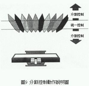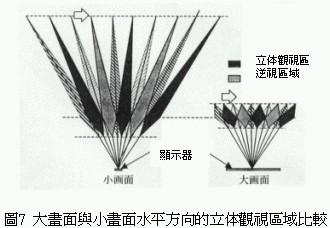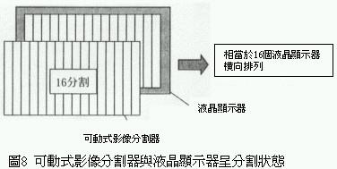 傳統(tǒng)的不需專用眼鏡的三維立體影像顯示器,同樣水平方向時(shí)小畫面的前后方向的立體可視范圍比大畫面的立體可視范圍大(圖7),這是因?yàn)樾‘嬅娴囊暯潜容^小,液晶顯示器與影像分割器較不容易產(chǎn)生所謂的moire干涉縞。利用這種物理現(xiàn)象將液晶顯示器與影像分割器,藉由電子方式分割成16等份各別掌控專屬區(qū)域(圖8)