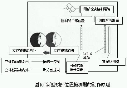 為了改善上述缺失因此開(kāi)發(fā)出頭部檢測(cè)系統(tǒng)(headtrackingsystem),利用這種檢測(cè)系統(tǒng)可隨時(shí)偵測(cè)觀視者頭部位置,一旦產(chǎn)生逆視領(lǐng)域時(shí)顯示器會(huì)立即切換左右兩眼所讀取的影像,如此一來(lái)不但可以防止逆視問(wèn)題的發(fā)生,還可以擴(kuò)大三次元立體影像的可觀視范圍.