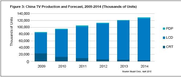 據(jù)iSuppli公司,中國電視市場已經(jīng)是全球舞臺上的主角,預(yù)計2010年再度有強(qiáng)勁表現(xiàn),整體電視產(chǎn)量上升,同時對于液晶電視的需求大增。