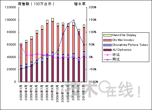 2010年3月臺(tái)灣四家大型液晶面板廠商的銷售額環(huán)比增加了9%。2010年3月18日由臺(tái)灣群創(chuàng)光電(Innolux Display)、原奇美電子(ChiMei Optoelectronics)和統(tǒng)寶光電(TPO Displays)合并成立的臺(tái)灣奇美電子(Chimei Innolux,CMI)3月份的銷售額不包括原奇美電子和統(tǒng)寶光電3月1日~3月17日的銷售額。如果加上這部分銷售額的話,預(yù)計(jì)四大廠商的合計(jì)銷售額將環(huán)比增加25%左右。