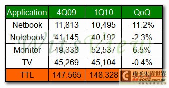 展望2010年第二季,WitsView認為第一季過度樂觀的出貨表現(xiàn),使得主要應(yīng)用別的下游市場均存在庫存升高的疑慮,雖然目前仍未出現(xiàn)一線品牌明顯的砍單效應(yīng),但從4月下旬面板價格已出現(xiàn)小幅度下跌的指針來看,支撐出貨量持續(xù)攀升的動能將有可能趨緩,因此WitsView現(xiàn)階段保守預(yù)估第二季整體面板出貨量僅將小幅成長2%,未來品牌大廠需求減少幅度將為關(guān)鍵。
