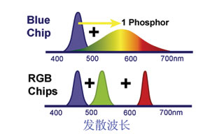 一般而言,小型LCD顯示屏背光照明都是用一組白光LED來實現(xiàn)的??墒?,使用白光LED的問題是其光譜對光復(fù)制并不是很理想。原因是白光LED其實就是在藍(lán)光LED面上加上一層黃色磷光劑。這樣便造成光譜有兩個波峰,一個在藍(lán)色而另一個在黃色。圖3給出一個典型的白光LED與RGBLED光譜比較。