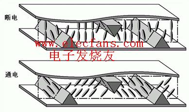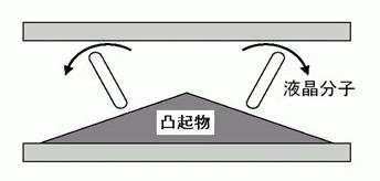 如圖,它依*叫做Protrusion的屋脊?fàn)钔蛊鹞飦硎挂壕П旧懋a(chǎn)生一個(gè)預(yù)傾角(Pre-tiltAngle)。這個(gè)凸起物頂角的角度越大,則分子長軸的傾斜度就越小。早期的VA模式液晶凸起物只在一側(cè),後期的MVA凸起物則在上下兩端。