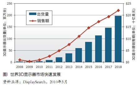 市場研究公司DisplaySearch日前發(fā)表一份專門報(bào)告稱,在3D電影成功的促動(dòng)下,3D顯示器市場將于2010年開始起飛,預(yù)測3D顯示器出貨量將從2008年的70萬個(gè)增長到2018年的1.96億個(gè),10年內(nèi)年均增長率達(dá)75%,同期銷售額從9億美元增長到220億美元,年均增長率38%(圖1)。世界消費(fèi)電子廠商將隨著推出一批3D有關(guān)產(chǎn)品,包括電視機(jī)、監(jiān)視器、筆記本電腦、藍(lán)光盤播放器、數(shù)碼相機(jī)、攝像機(jī)、相框等進(jìn)軍家庭市場。加上立體顯示原來就有的醫(yī)療等專業(yè)應(yīng)用以及廣告、公共顯示牌等應(yīng)用,都會(huì)成為促動(dòng)顯示產(chǎn)業(yè)開始從平板產(chǎn)品向著3D大進(jìn)軍,這也是一次從平板顯示轉(zhuǎn)向立體顯示的革命。